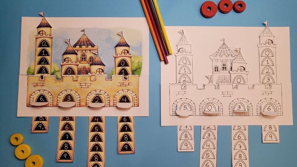 Available in both black & white and color versions, this original resource is versatile and easy to use. Cut out the castle, glue it onto cardstock, and leave space for the towers to slide. Each gate reveals a single digit, allowing for interactive number exploration.